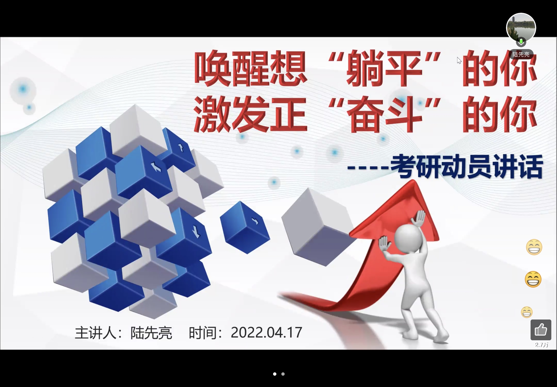 最后,陆先亮做“唤醒想‘躺平’的你,激发正‘奋斗’的你”考研动员大会总结讲话。他从为什么要考研、如何选择考研、如何解决后顾之忧三个方面出发,让同学们对考研有了更加正确明晰的认识。陆先亮表示学院非常重视研究生工作,正在通过课程安排、服务保障和奖励资助政策三个途径来帮助、鼓励学生。同时我校科研条件不断完善,研究生导师师资雄厚,希望各位考生积极报考母校。考研是一项伟大的工程,它是对人的意志力,判断力,交际力等综合能力的考研,他勉励同学们要坚持复习,科学选择学校,积极应对考试,坚定必胜的信念,通过自己的努力取得好成绩。