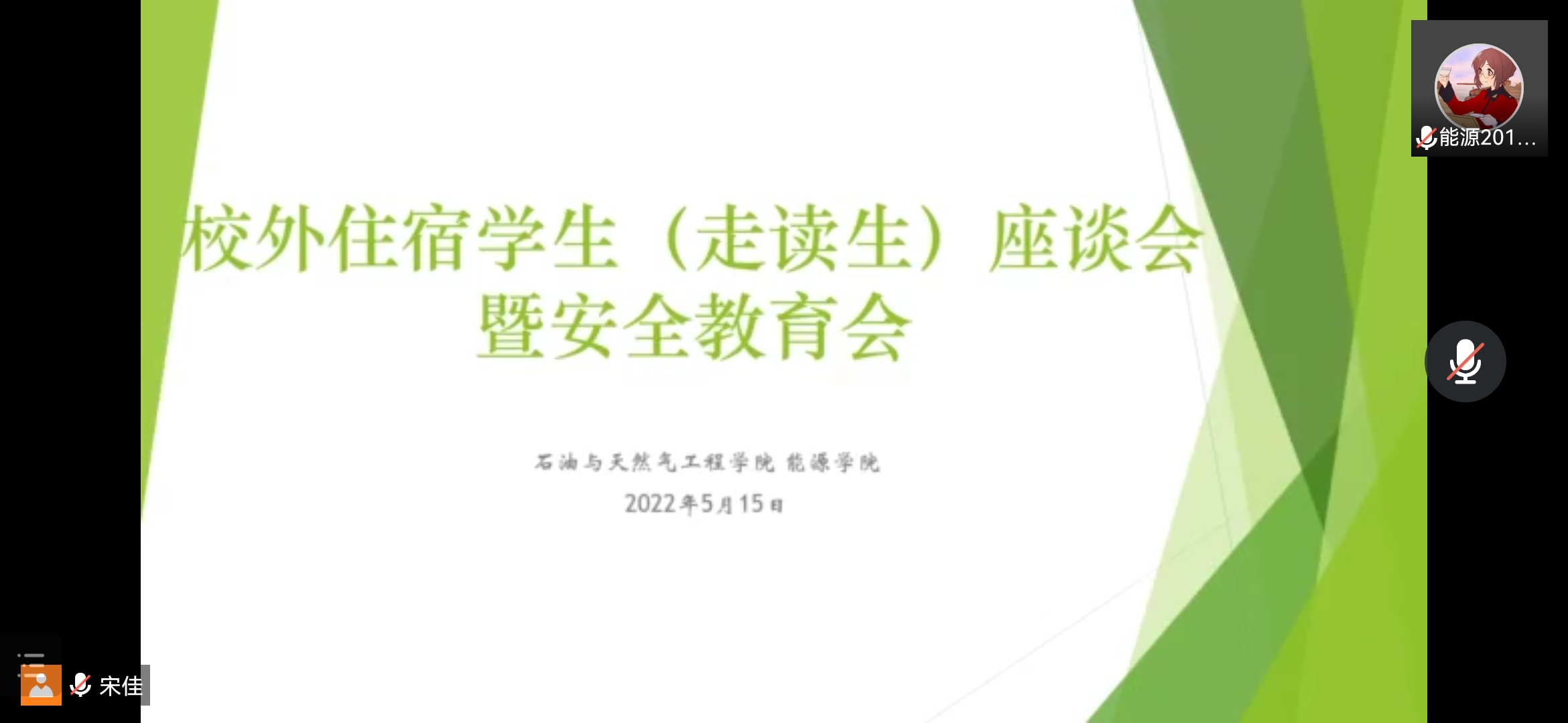 为进一步加强对校外住宿学生的管理,提高校外学生安全防范意识,同时了解校外学生学习生活上的情况,我院于5月15日下午1:30召开校外住宿学生线上座谈会,学院党委副书记陆先亮出席会议,我院全体校外住宿学生参会,会议由院学工办主任宋佳主持。