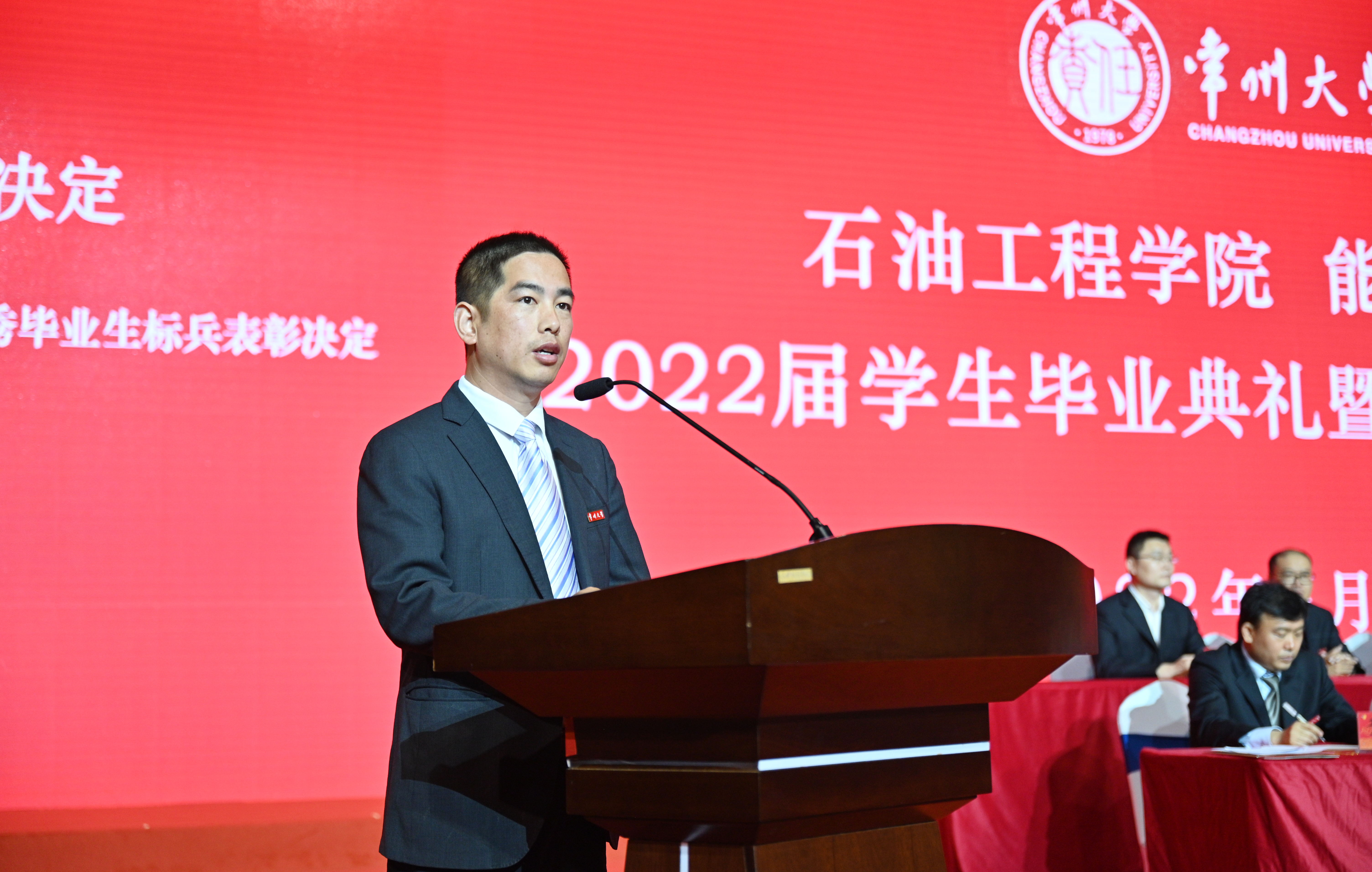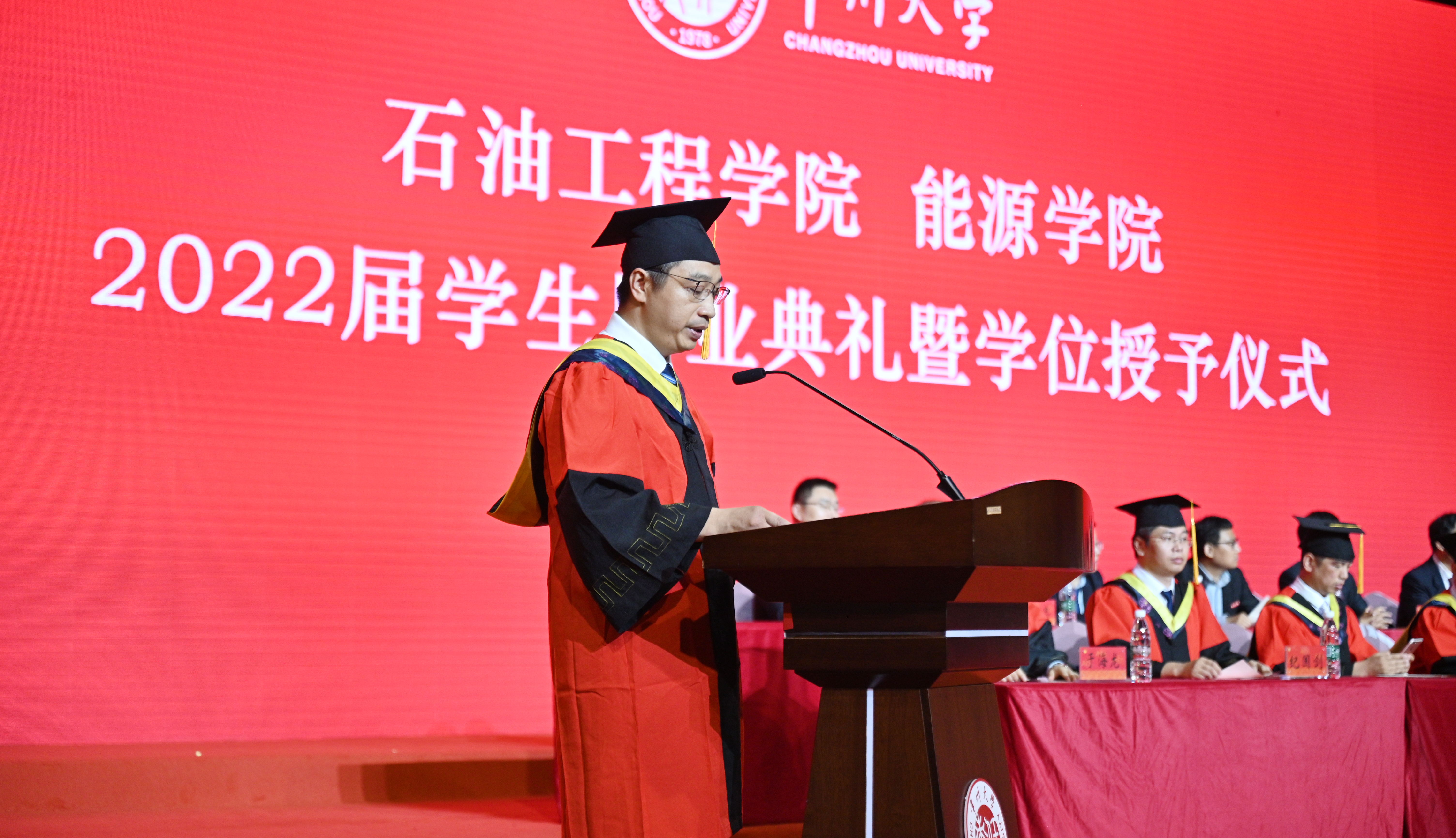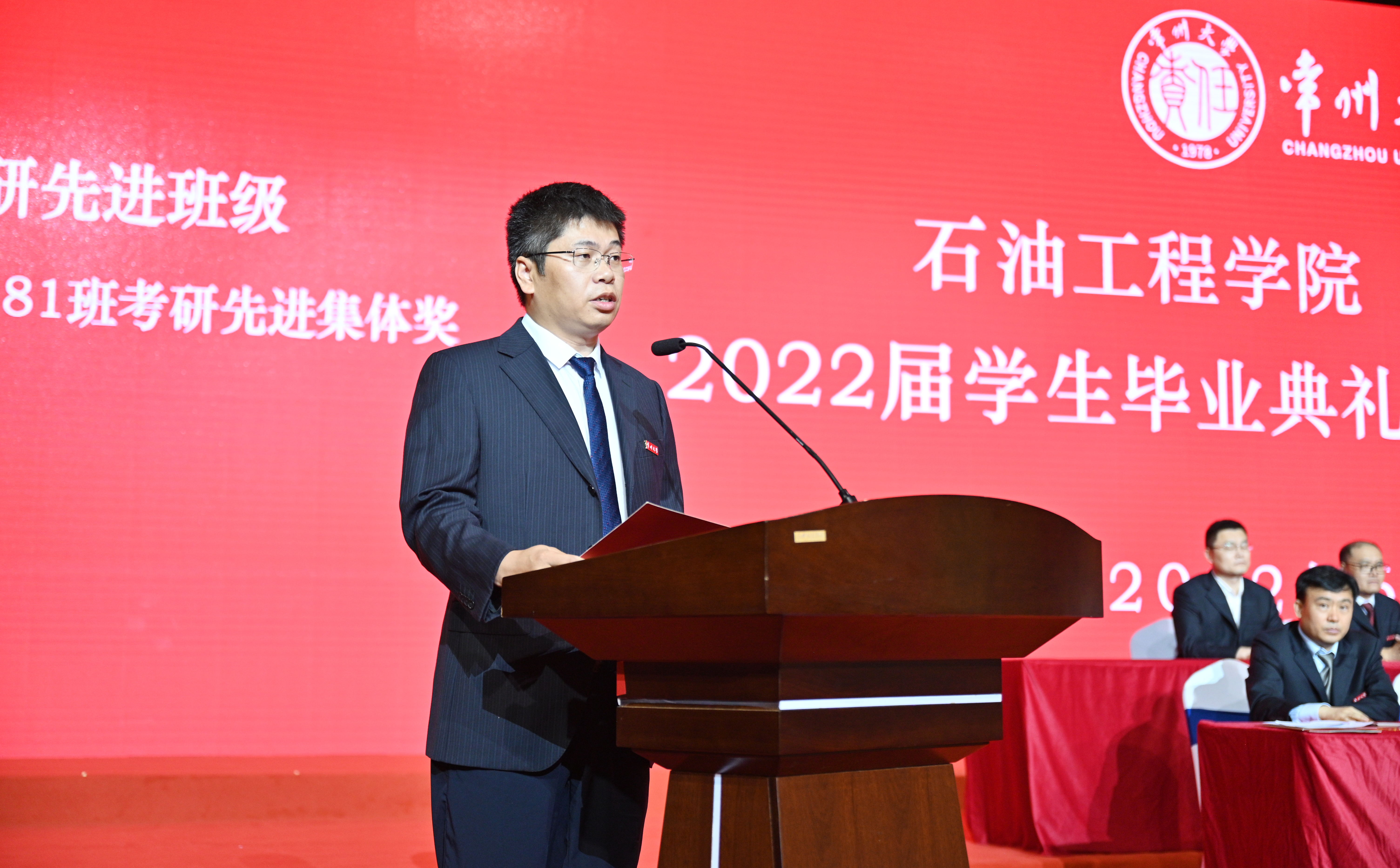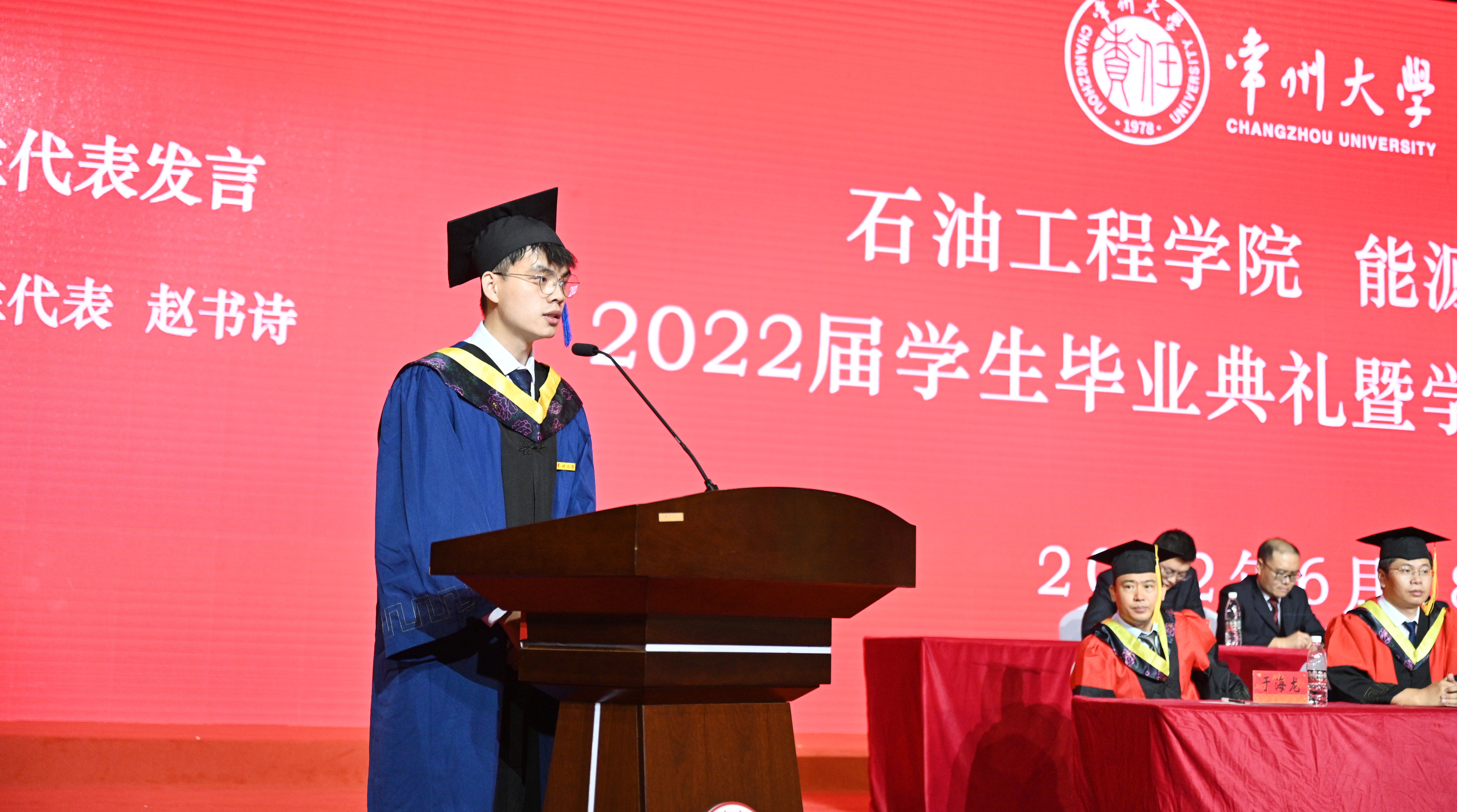 典礼在庄严的国歌声中拉开了序幕。纪国剑宣读2022年考博考研先进个人和先进集体的表彰决定。赵会军宣读优秀毕业研究生表彰决定。陆先亮宣读2022届本科生优秀毕业生、优秀毕业标兵的表彰决定。王政伟宣读常州大学2022届校友工作联络员的表彰决定,并为他们颁发奖状。彭浩平宣读硕士学位授予决定,周诗岽宣读学士学位表彰决定。王永利为考研先进个人和先进集体发放奖金,彭明国为考博先进个人和校优秀毕业研究生颁奖,王政伟为校友联络人颁发聘书。院领导和学术委员会委员为优秀本科毕业生和优秀毕业生标兵颁奖,并为全体毕业生拨流苏、颁授学位证。随后,本科生毕业生代表姜科鑫、研究生毕业生代表赵书诗、教师代表董亮、家长代表徐晟洺依次发言。