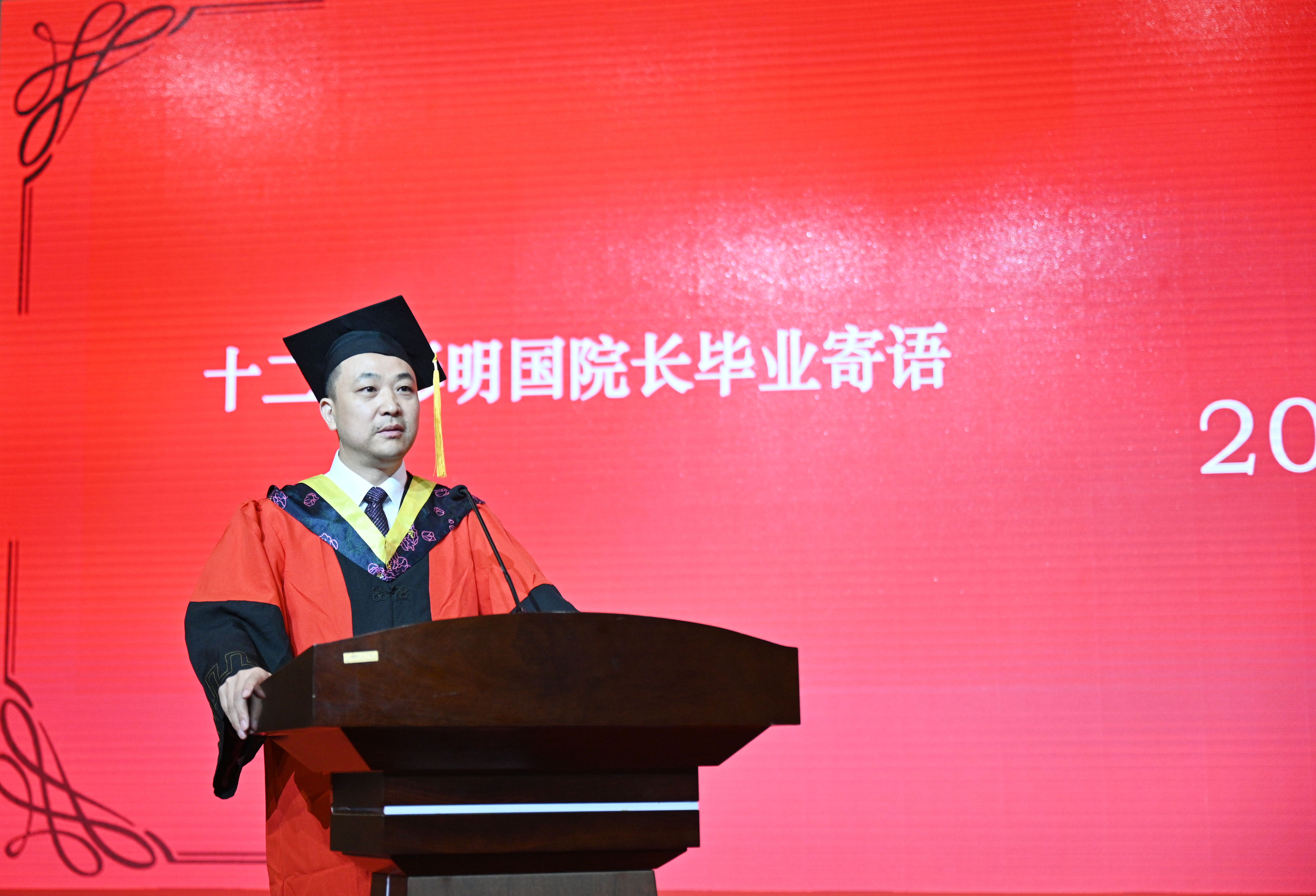 典礼最后,彭明国院长作毕业寄语。他向全体毕业生表示最热烈的祝贺!向关心学院发展的家长朋友们致以衷心的感谢!向潜心育人的老师们致以崇高的敬意!他希望全体毕业生学会“坚强”、学会找出解决问题的方法,并希望大家在未来的日子里,能时时回望大学给予的人生体验和感悟。祝愿全体毕业生:内心有光,精神明亮。