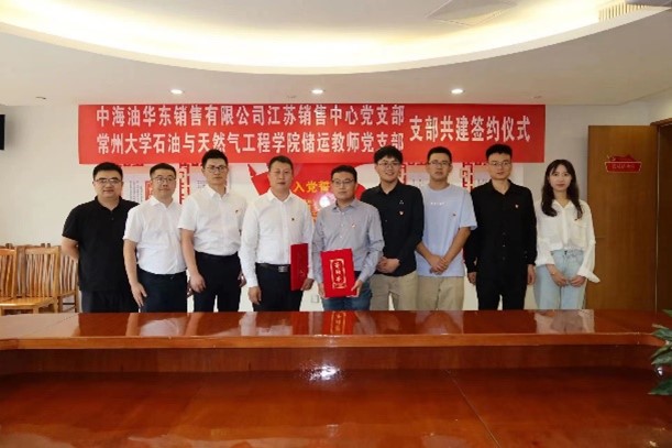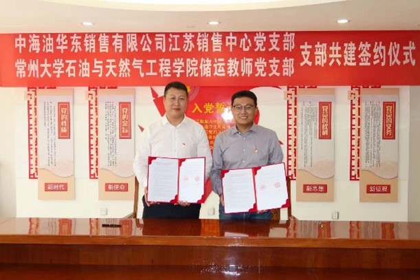 常州大学石油与天然气工程学院油气储运教师党支部书记吕晓方,中海油华东销售有限公司江苏销售中心党支部书记邵志虎在仪式上共同签署了“结对共建”的协议书,双方对各自的党建工作的成果进行了详细地介绍,对党建的经验和心得体会进行了充分地交流,对今后校企支部共建的相关内容进行了讨论和补充。双方一致认为,校企双方所具有的石油专业特色,有利于调动双方党员参与支部共建的积极性,有利于制定出更适合企业需要的人才培养模式,有利于促进相关的科研技术向企业生产实际需求转化和升级。
