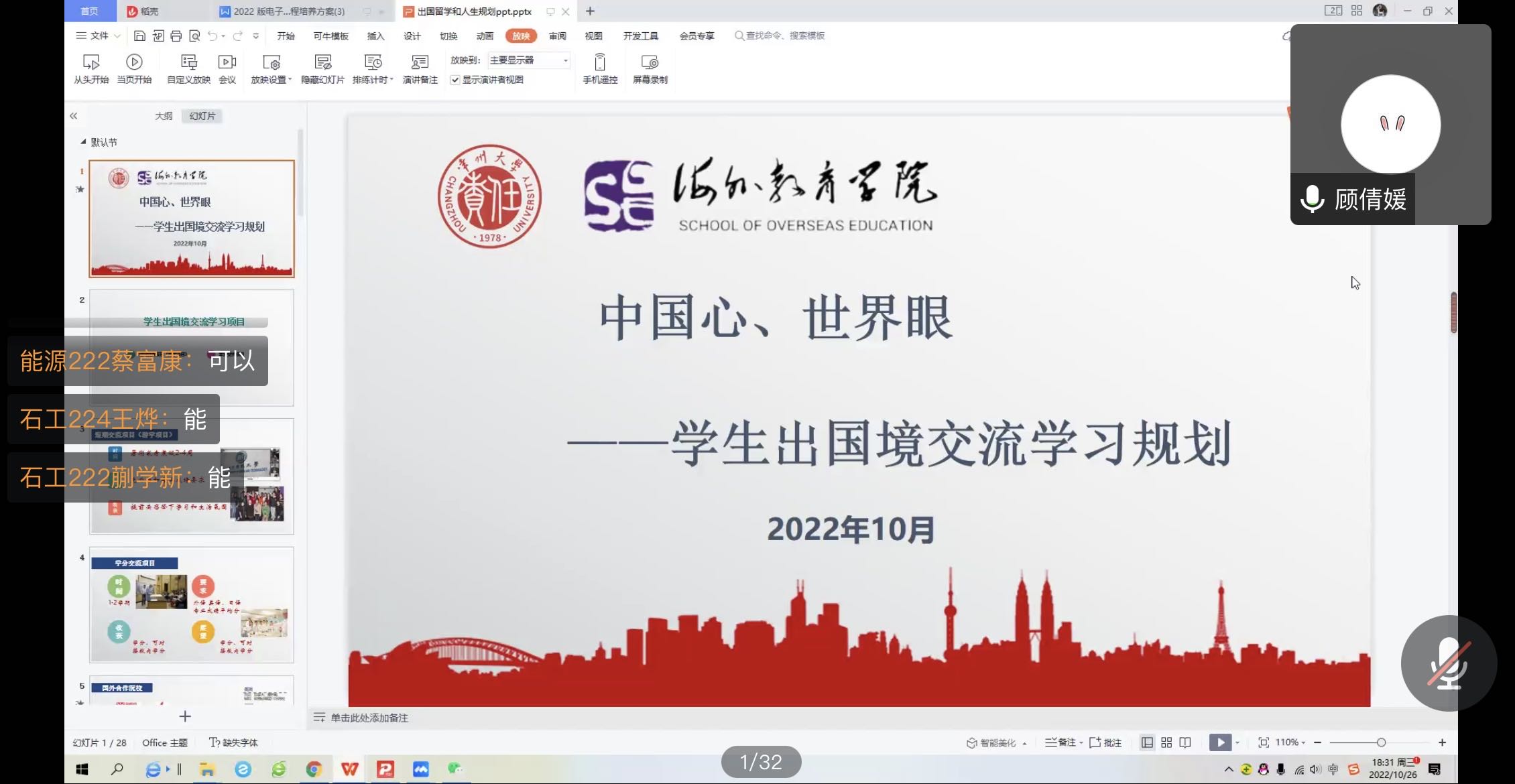 为帮助我院学生全面、深入了解学校及学院各类出国(境)交流项目及相关支持政策,10月26日晚,学院邀请国际处顾倩媛老师为大家做线上本科生出国境政策宣讲。22级辅导员张天露老师与全体大一学生参加了此次宣讲。