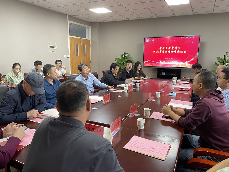 2022年10月31日下午,常州大学-常州市河北商会捐资助学交流会在科教城乐行楼652会议室举行。常州市河北商会会长冯维亚、商会支部书记陈飞、监事长谷自战、副会长贺勋、齐闯、张永雪、张建峰、杨双印、韩跟成、李占军等河北商会领导,石油与天然气工程学院 能源学院党委书记王永利、副书记张小远、商学院专业教师潘伟强,以及各学院教师代表代文杰、王国宇、吕倩倩、2021年度获得资助的河北籍在校生等参加了交流会。
