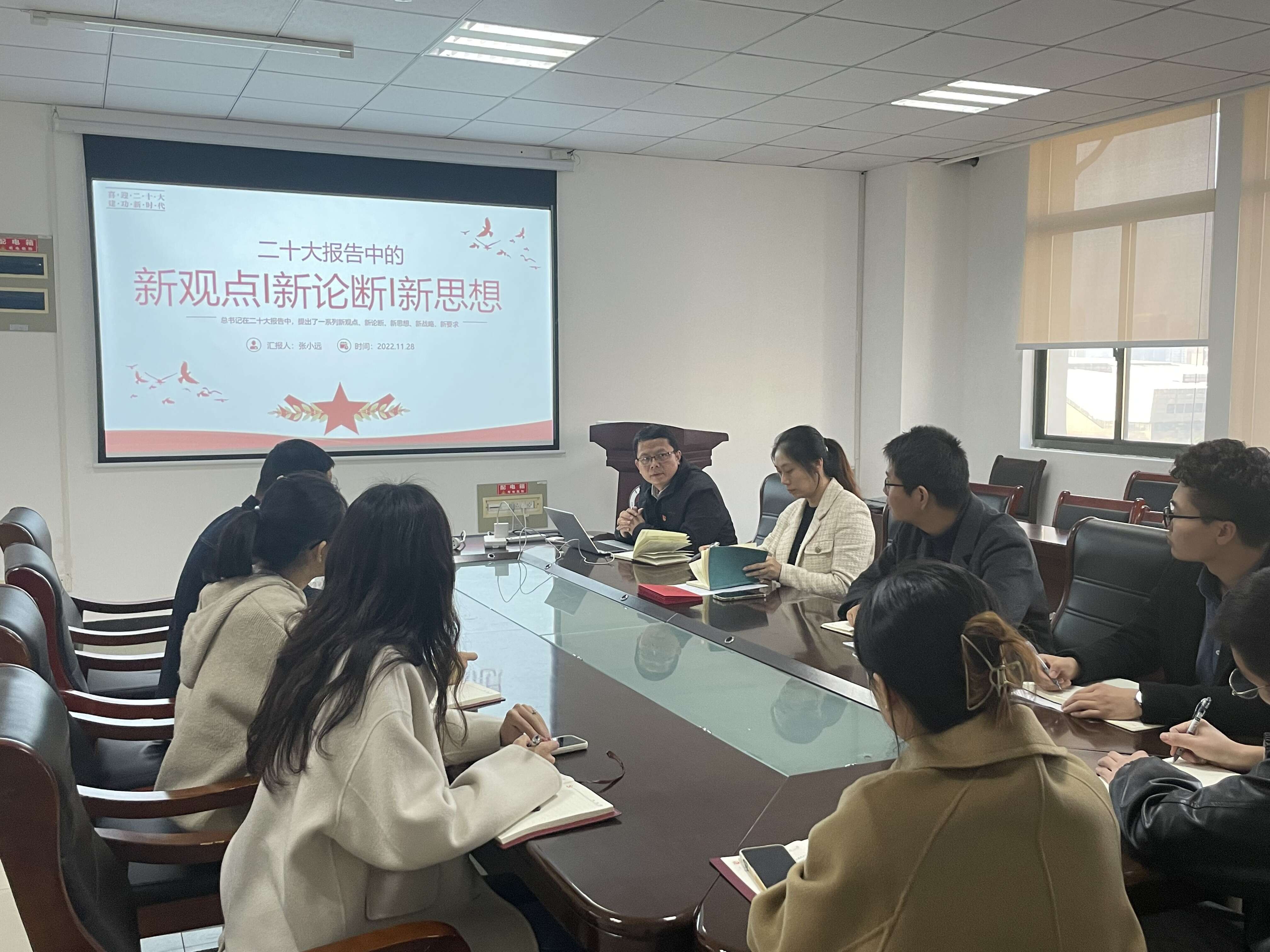 为学习贯彻党的二十大精神,持续深入贯彻落实习近平总书记重要讲话,2022年11月28日下午,学院教工行政服务党支部于乐行楼651开展了“学习贯彻二十大精神”专题党课活动。党课由学院党委副书记张小远进行讲授,支部全体党员参加了学习。