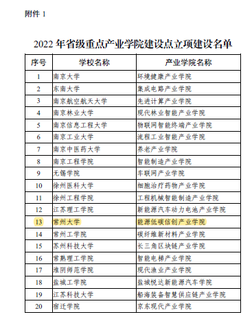 近日,江苏省教育厅发布《2022年省级重点产业学院建设点遴选结果的通知》(苏教高函〔2022〕18号),我院喜获2022年江苏省第三批重点产业学院建设点。本次申报共有45所部、省属本科高校参与,经过激烈的角逐,我院能源低碳信创产业学院脱颖而出,入围最终的20个省级重点产业学院建设点。