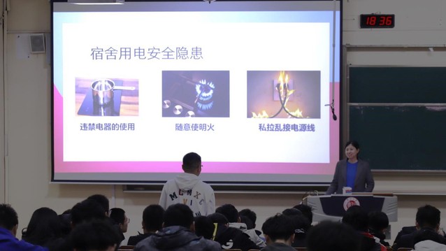 赵文安从一段有关宿舍火灾的实例视频开始切入,用惨烈的教训提醒同学们宿舍安全的重要性。在分析了起火原因后,赵文安开始逐一介绍用电不规范、宿舍盗窃、宿舍推销诈骗、未归晚归等宿舍安全隐患,并给出了具体的应对方法和建议,希望同学们能在应对这些隐患问题时能做出正确的判断与行动。