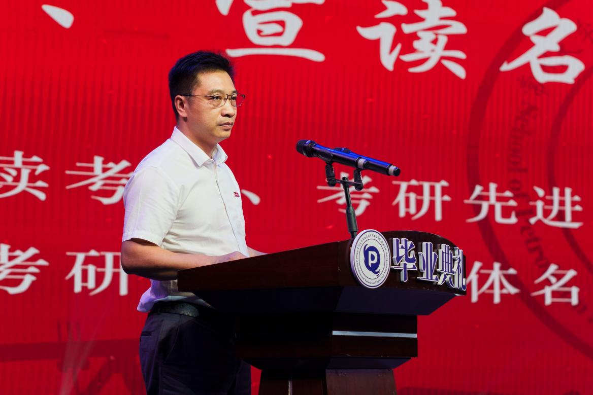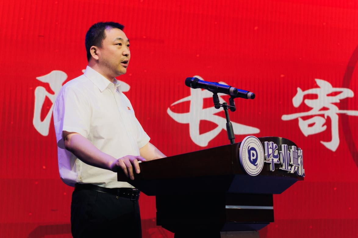 典礼在庄严的国歌声中拉开了序幕。院党委书记彭浩平、副院长周诗岽、院党委副书记王永、院校友会会长王政伟分别宣读了2023年考博、考研先进个人和先进班集体的表彰决定、2023届校优秀毕业研究生推荐名单、2023届校本科生优秀毕业生、优秀毕业生标兵推荐名单、2023届校友工作联络员的聘任决定,并为以上毕业生进行了表彰。学院两办一中心教师代表、各专业教师代表、校友会与退休教师代表以及学生公寓管理员代表为毕业生们送上了诚挚的祝福。典礼最后,彭明国院长作毕业寄语。他代表学院向全体毕业生致以热烈的祝贺和美好的祝福!他对全体毕业生提出三点希望:一是希望毕业生们胸怀“国之大者”,做一个有家国情怀的人;二是希望毕业生们秉承公诚勇毅,做一个实干担当的人;三是希望毕业生们勇于拼搏进取,做一个锐意创新的人。