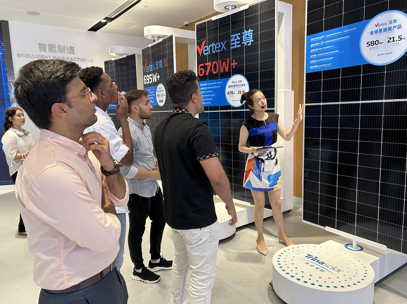 会前,讲解员带领师生参观了企业发展历程、主线产品、项目建设、海外业务情况陈列馆。天合光能作为一家上市公司,是一家全球领先的光伏智慧能源整体解决方案提供商,主要业务包括光伏产品、光伏系统、智慧能源三大板块。