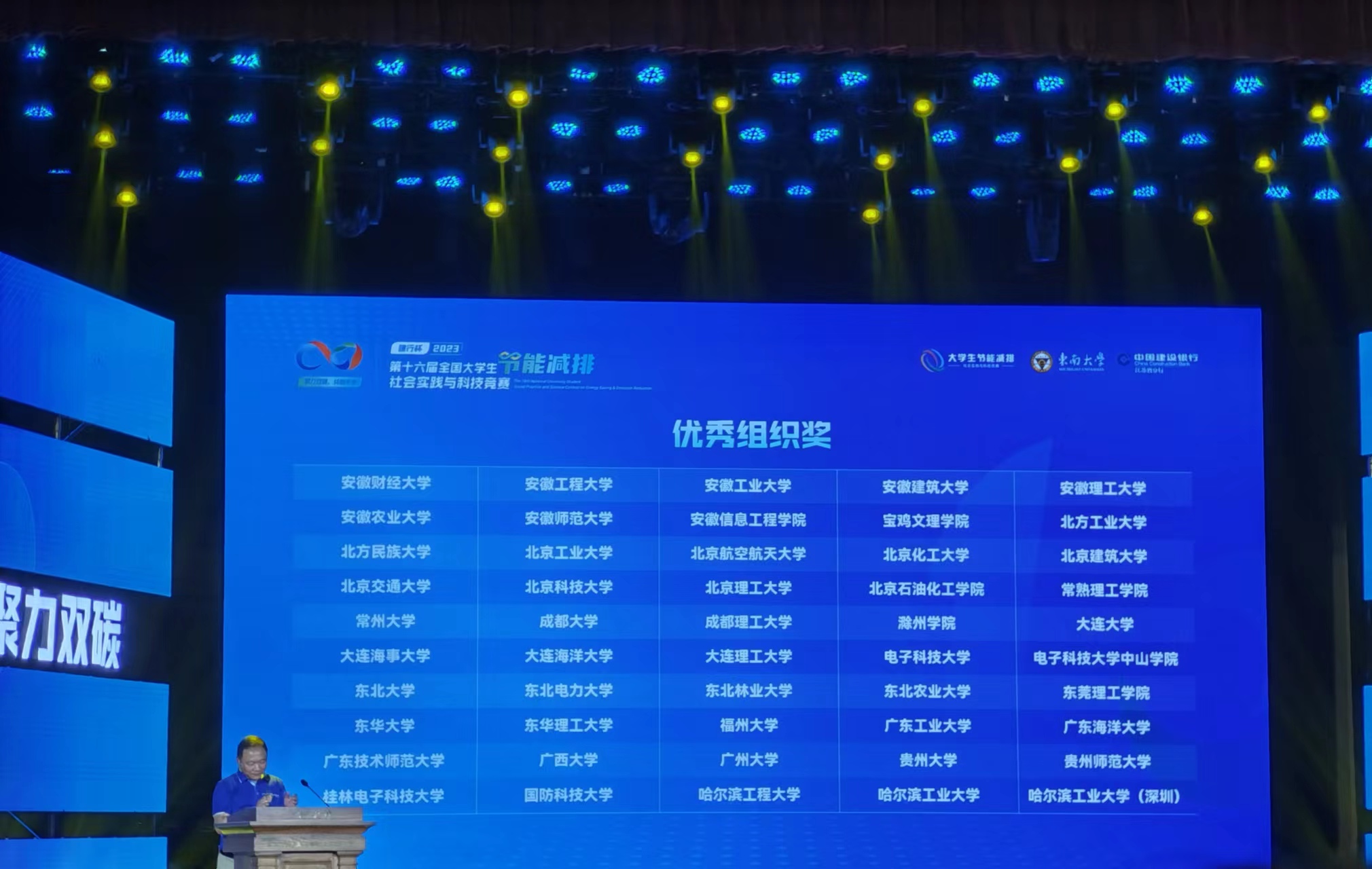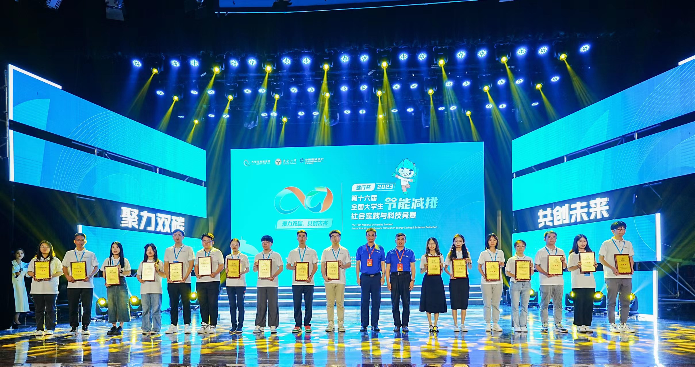 参赛学生代表陈轩领取全国大学生节能减排社会实践与科技竞赛一等奖(右五)