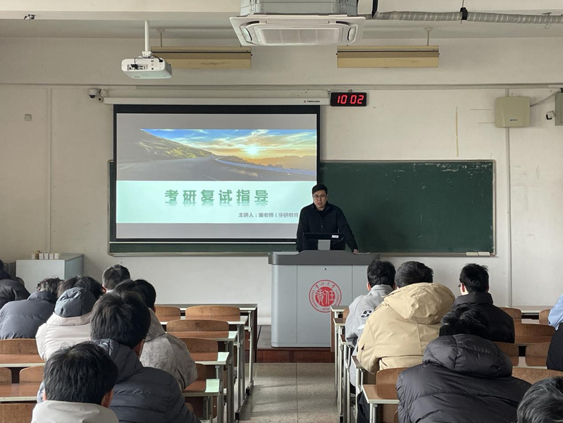 讲座中,董洪彬老师围绕复试全流程展开系统讲解,从复试政策解读、面试礼仪与仪态、专业问答技巧、英语口语准备、个人简历与材料打磨、调剂策略等方面,结合历年典型案例与实战经验,为同学们梳理核心考点与得分要点。他重点强调了面试逻辑表达、临场应变、心态管理的重要性,提醒同学们突出专业优势与科研潜力,规避常见误区。互动环节里,同学们踊跃提问,董老师逐一细致解答,现场氛围热烈。